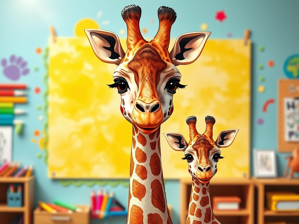 Sara decided to make a colorful poster for her project. She drew a large giraffe in the center and wrote down all the interesting facts around it. She used markers and glitter to make the poster bright and exciting. Sara also printed a picture of a baby giraffe to show how small they are when they’re born.